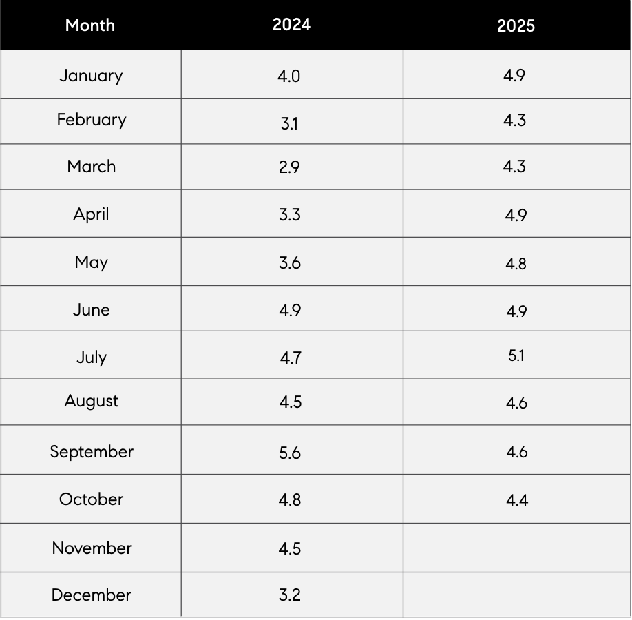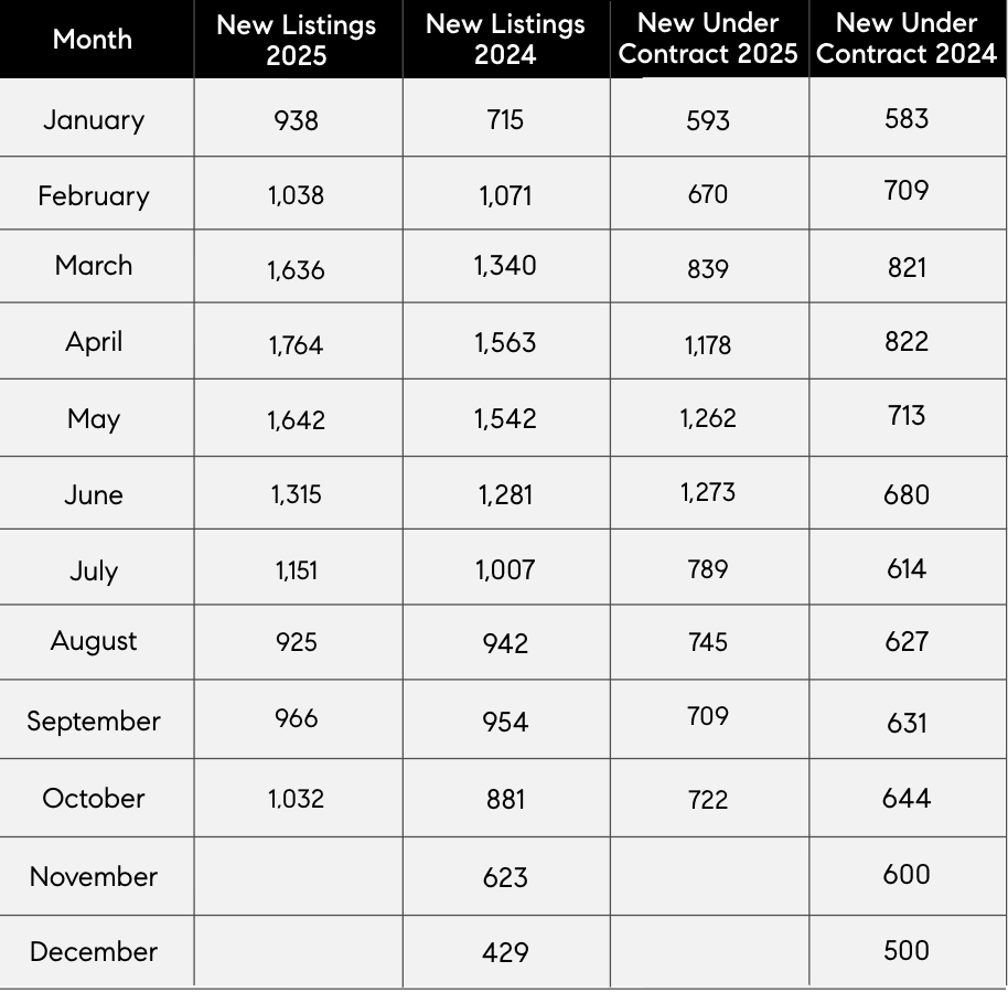 New listings in October totaled 1,032, showing a 17.5% increase from the previous year. Meanwhile, New Under Contracts (demand) reached 722, an increase of 13.7% from last October.