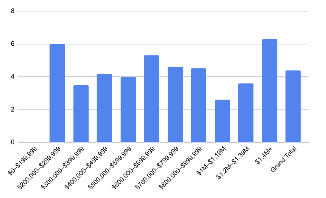 - The $300,000–$399,999 bracket is also tight at 3.5 months.